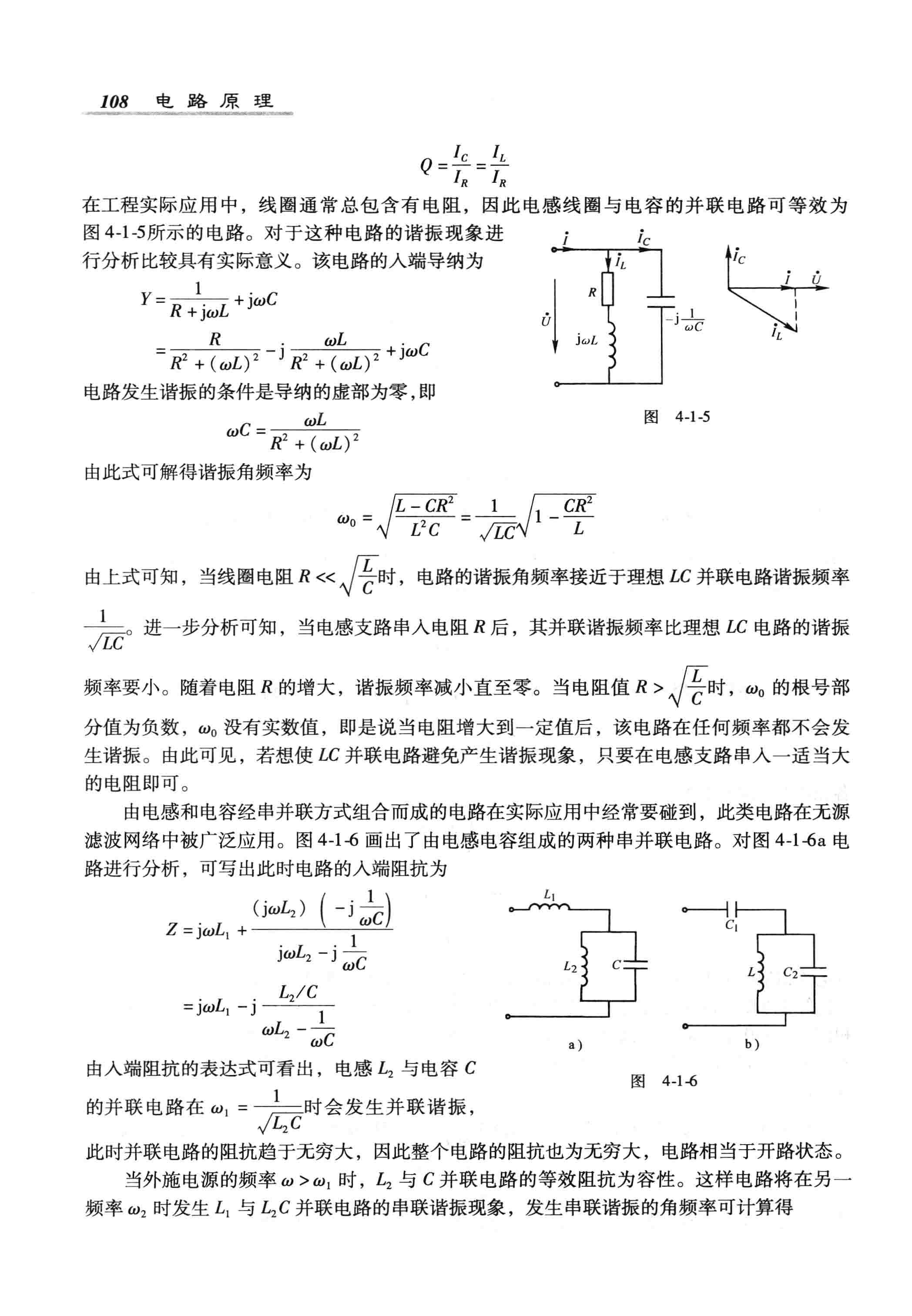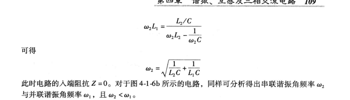 并联谐振时,若外加电压不变,则谐振时流入的电流最小,此电流等于电阻上流过的电流。 - 若并联电路中没有电导的支路,则谐振时入端导纳 。其等效阻抗 ,因此由 并联而成的电路在发生谐振时,其入端电流