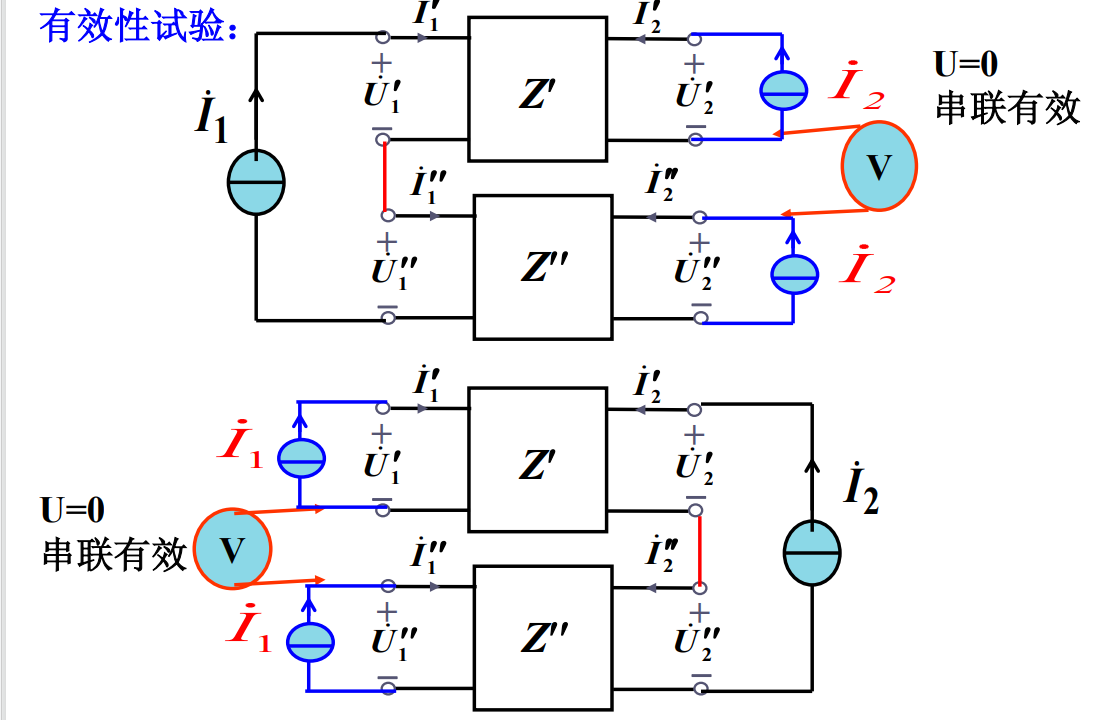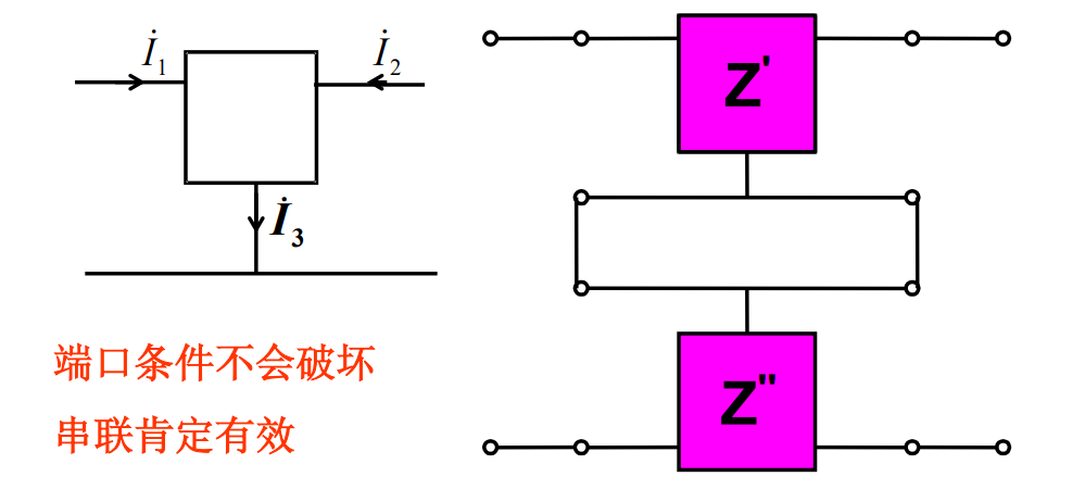(1)有效串联时,串联后复合双口网络Z参数矩阵等于两串联双口网络Z参数矩阵相加。可推广到n端口串联。