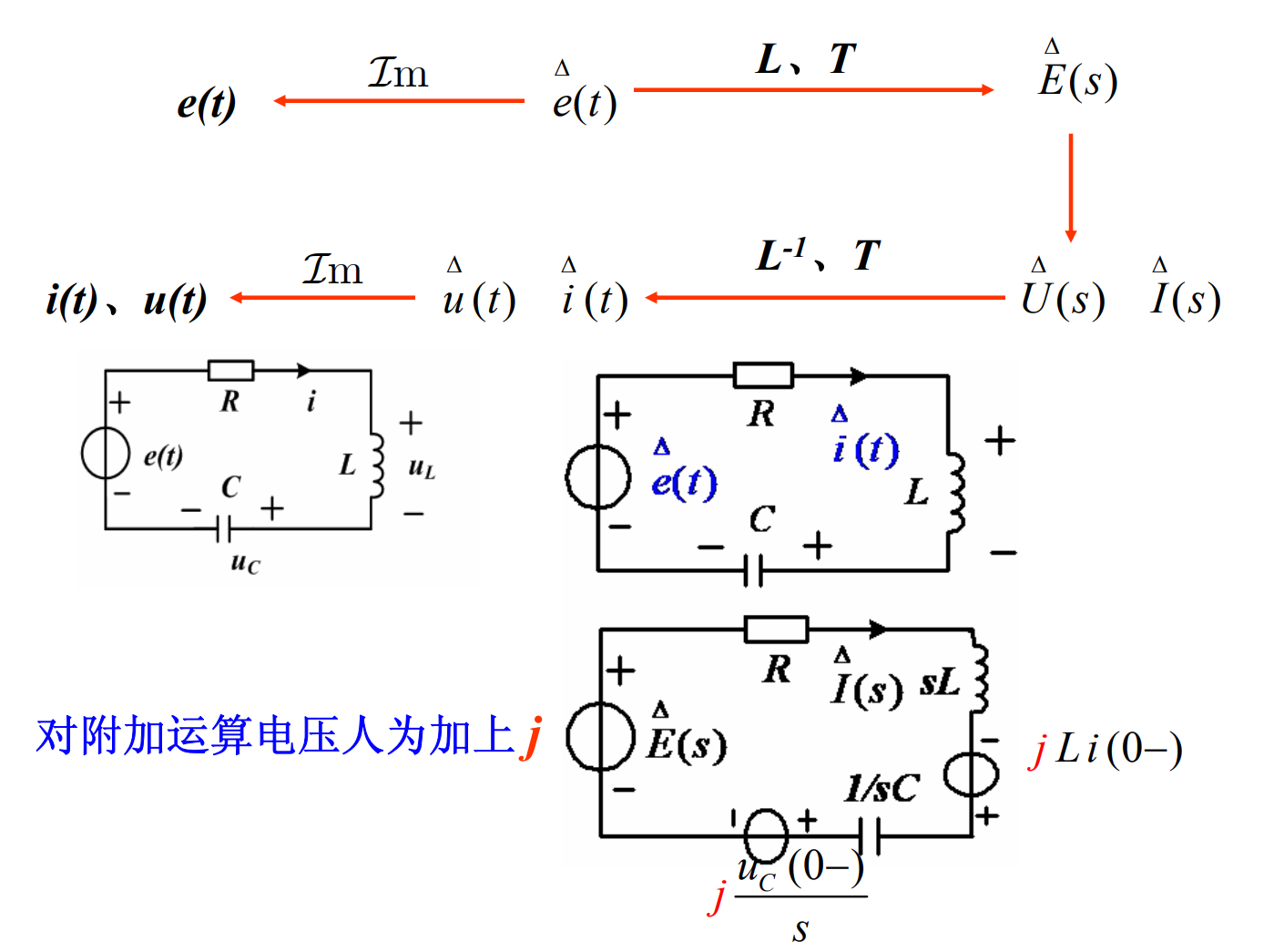 1. 只用初始条件,运用运算法求解,跳变情况自动包含在响应中;电路概念强调不够;