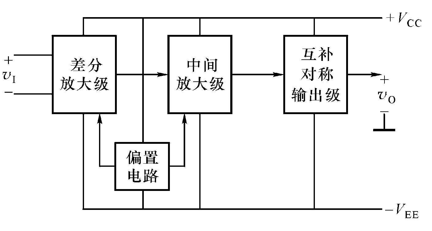 集成运算放大器是非常重要的一种集成电路,它的应用十分广泛。主要应用在模拟信号的运算、放大、信号产生、变换及检测等电路中,是通过半导 体集成工艺制成的一种高增益、直接耦合式多级放大器。 各部分作用: 输入级采用差分放大电路 -> 低温漂,高共模抑制 比和高输入电阻